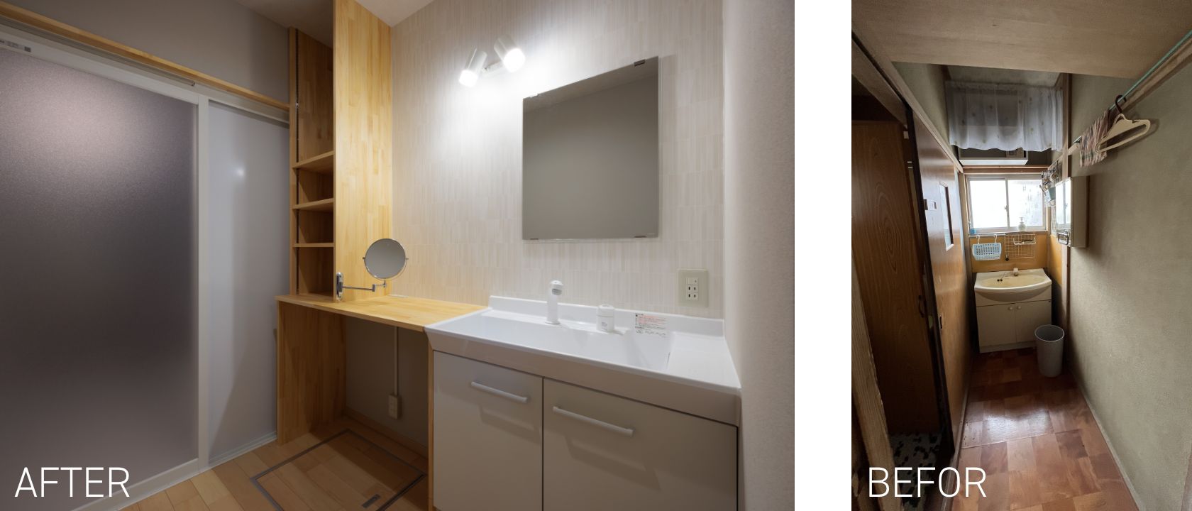 「ドレッサー兼洗面台カウンター、鏡位置なども希望する高さに調整してくれました。照明やコンセント位置も現場で確認しながら、使いやすい場所に変更。まさにオーダーメイドですね」