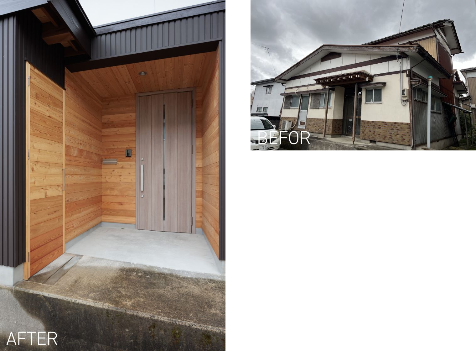 木の活用法にも興味を持っていたNさん。住宅内以上に玄関に木材をふんだんに使用し、外観全体のイメージもガラリと変わりました。